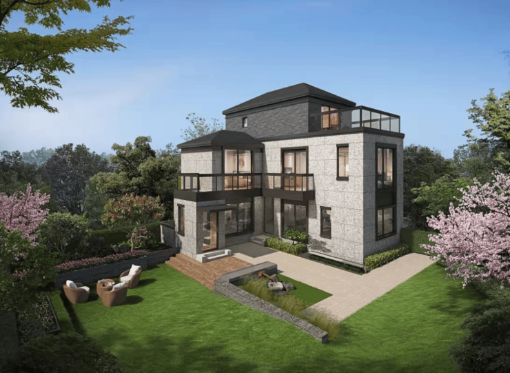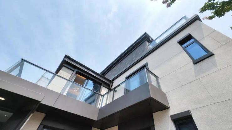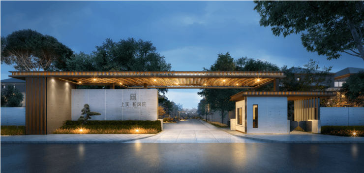 【上实·和风院】建筑外观是新中式格调,以黑色面瓦为黛顶,整体线条简洁明快。