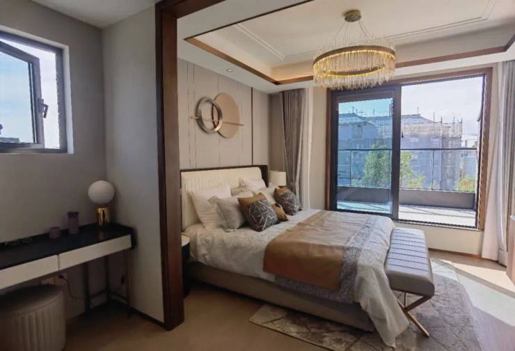 该户型二楼南向卧室有多面采光,这在上海极为少见。超长露台连接起两个卧室,如果家里有两个孩子,各自一个卧室,共通露台供其玩耍,别提有多开心。