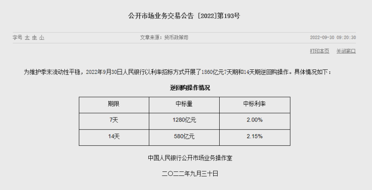 焦点财经讯 耿宸斐 为维护季末流动性平稳,9月30日,人民银行以利率招标方式开展了1280亿元7天期和580亿元14天期逆回购操作,中标利率分别为2.0%、2.15%。由于今日有20亿元逆回购到期,人民银行今日公开市场实现净投放1840亿元。