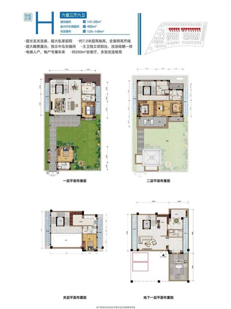 独栋别墅:建筑面积 126 ㎡--396 ㎡,实际使用面积281-766㎡,精装交付,花园面积84-282㎡