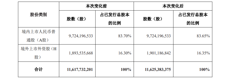 本次新增股份后,公司已发行股份总数由 11,617,732,201 股增加至 11,625,383,375 股,其中已发行 H 股总数由 1,893,535,668 股增加至 1,901,186,842 股,已发行 A 股总数保持不变,仍为 9,724,196,533 股。