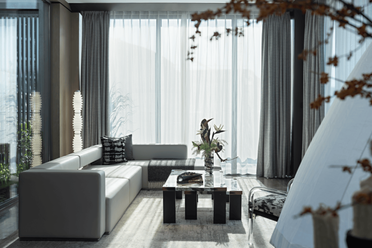 独立前院和礼仪玄关入户,一出电梯门,只见餐客厅和书房一字排开,面宽达约19.8米。一个环绕式超级露台,长度达约30米!设计糅合山居生活与当代设计风格,以静谧优雅的风格诠释国际现代奢华的诗性与意韵。