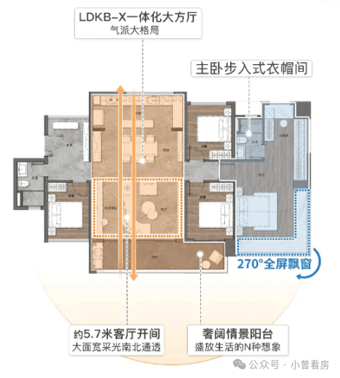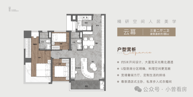 其中88㎡三房两厅两卫户型,总价约369-377万,户户朝南,客厅开间约5米,连接阳台,采光通风俱佳,主卧带270°L型飘窗和步入式衣帽间,空间利用率高,适合刚需家庭;