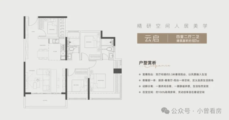 107㎡四房两厅两卫户型,总价约449-455万,玄关与客卧合理衔接,空间规划紧凑实用,客厅采光充足,动静分区明确,能满足刚需改善家庭的居住需求;