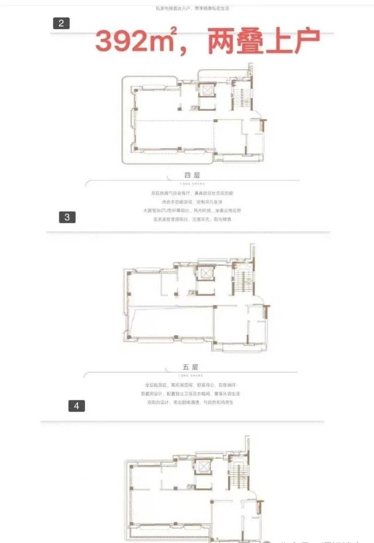 其中,两叠的上叠面积为392㎡,花园面积区间约为123-298㎡,天台面积约为93㎡,实用率193-259%;