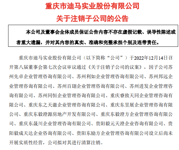 为降低运营成本,迪马股份拟注销15家子公司