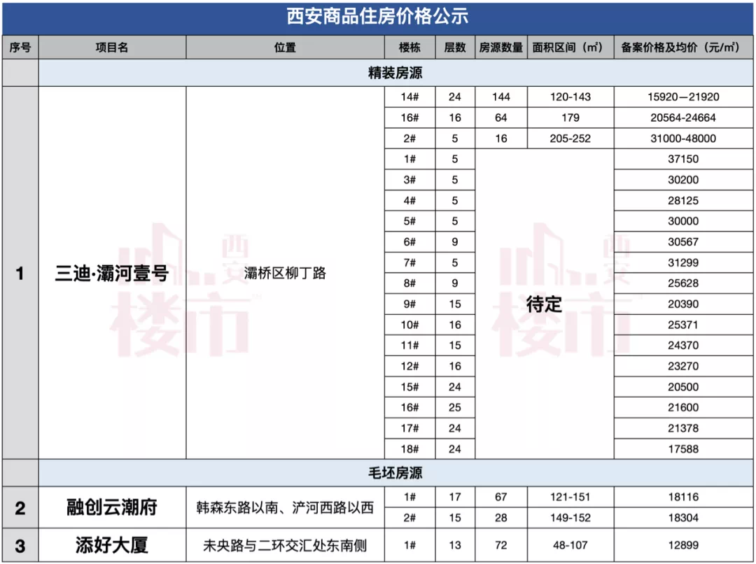 本周,三迪·灞河壹号、融创云潮府、添好大厦,3盘公示,具体价格情况如下: