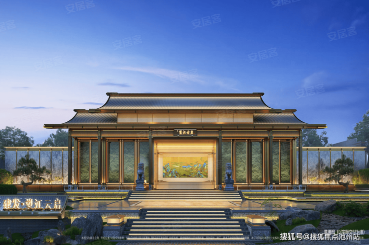 建筑设计:采用现代新中式立面,以香槟金铝板与三玻Low-E玻璃为主,窗墙比达0.65,配合双起翘弧形塔冠设计,形成独特的城市天际线。