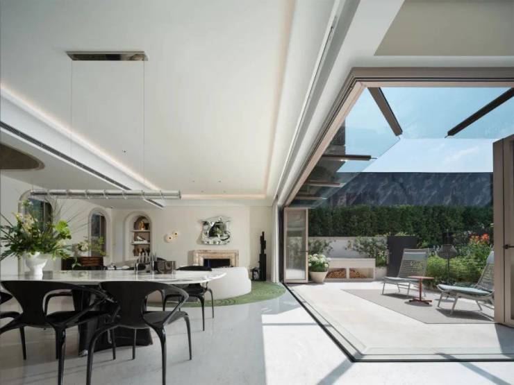 这个270°的转角玻璃是可以打开的,打开后花园与室内空间无界相连,让居者与自然的“无间亲密"重新回归。