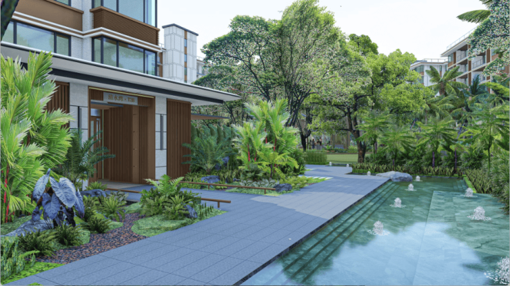组团内曲折蜿蜒的景观轴线串联起各个组团庭院,整体简洁大气的氛围,舒适自然的花园空间,热带风情的植被设计,营造优雅舒适的海岛热带度假风情,打造高品质人居生活环境。