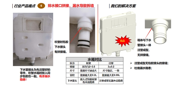 邦吉威水箱设计更是解决了壁挂水箱漏水风险,邦吉威研发较新注塑水箱,成本非常高。现在市面上基本是传统的吹塑水箱,因为吹塑生产方便,产量大,不是一体注塑成型很容易有漏水风险。真正的最保险的水箱是一体注塑成型,是要底部的一体成型。而邦吉威卫浴注塑水箱就能解决底部的一体成型。
