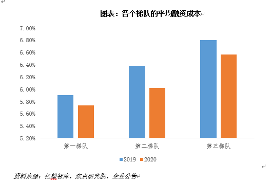 带来的结果是,2020年房企融资成本实现普降,房企融资成本格局趋于稳定。