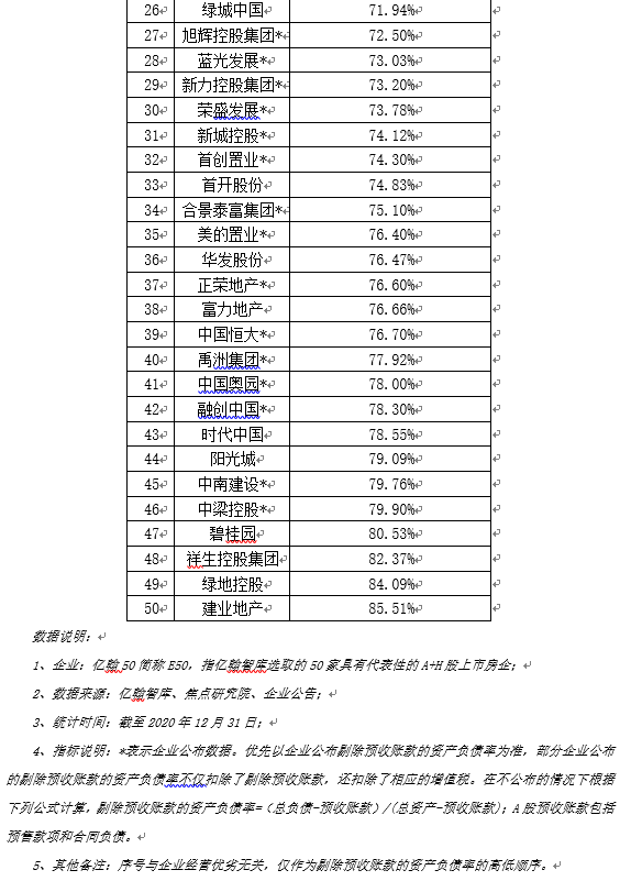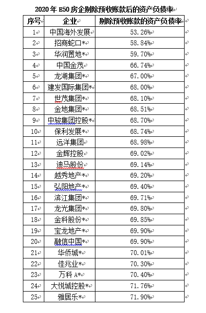 2020年E50房企剔除预收账款后的资产负债率