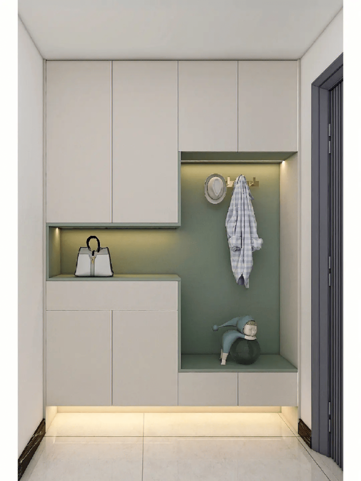 门厅的柜子一般用来存放临时穿的衣服、鞋子以及其他家居生活用品,没有把手的收纳柜子让门厅处更加整洁有序。