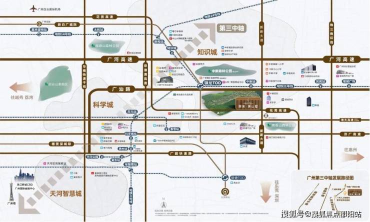 搭乘新白广城轨,2站可达新塘,从知识城出发,到达白云机场仅3站,连接穗莞深城际直达深圳机场,快意纵横大湾区。