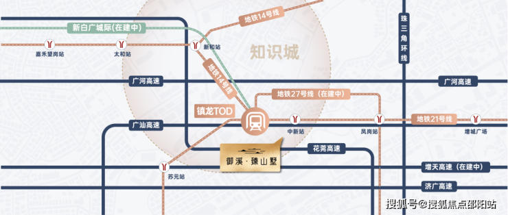 项目距地铁21号线中新站仅约500米,通过家门口的21号线,便可实现1站镇龙TOD、4站天河。而镇龙TOD,又可进一步握手“3地铁+1城轨+5高速”的超级路网,通过14号线可快速畅连黄埔、白云核芯区;