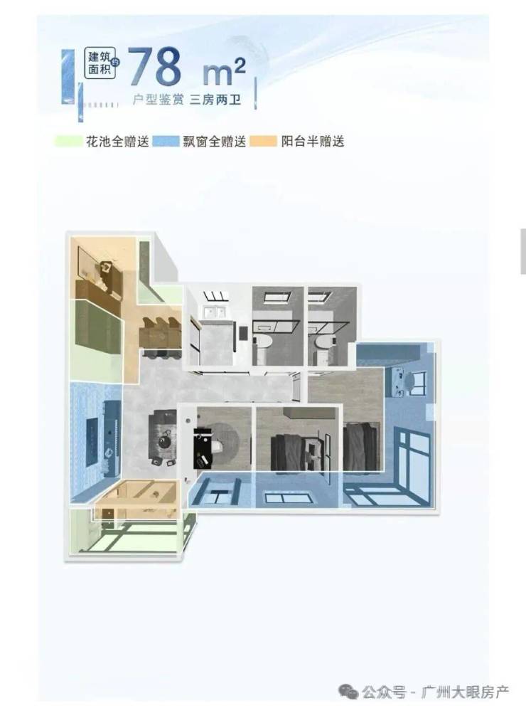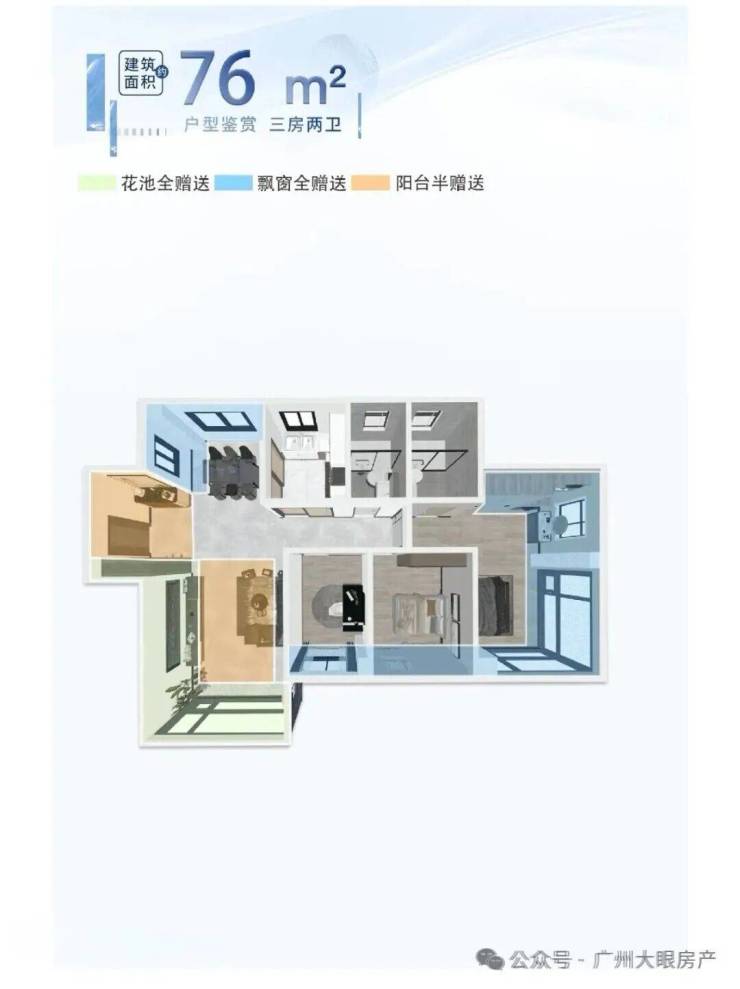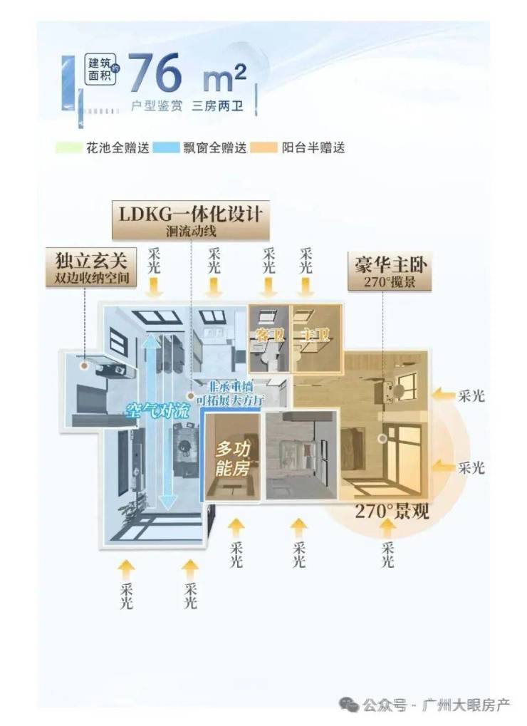 放眼整个白鹅潭,小三房固然稀缺,但能做到全屋空气对流+双卫的80平以下小三房,仅此一盘。