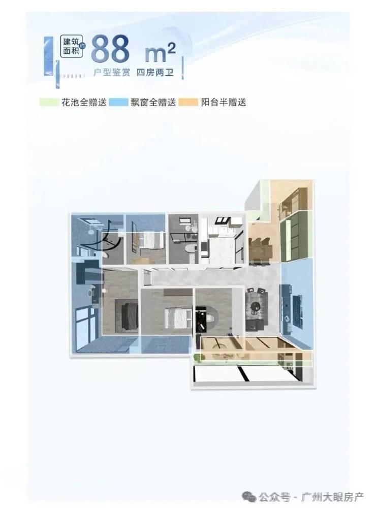 88平四房,不仅做到四房,还实现了四空间两卫双开配景观阳台。• 同等面积多一房,叫板周边一众新盘