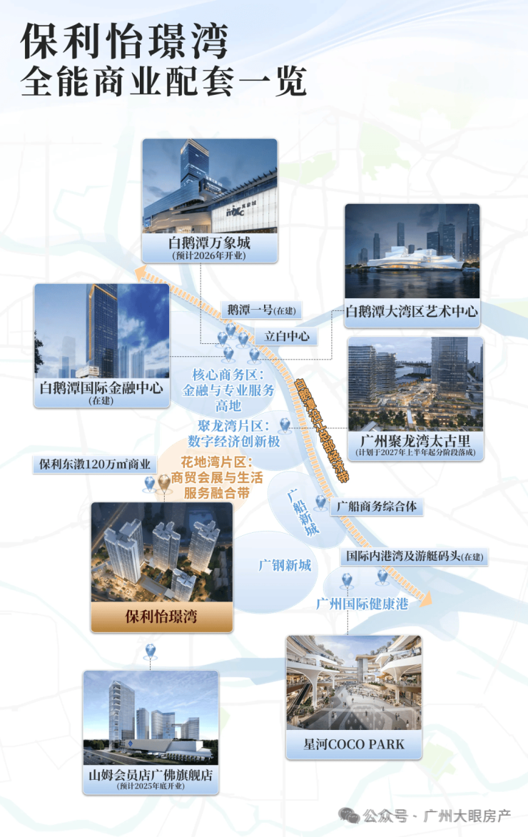 商业上,背靠保利东漖120万㎡能级配套,配置面面俱到,内部还有约40万方花地湾商业集群,四大商业街区等,直线距离规划中的18万㎡理想花地商业仅约700米。