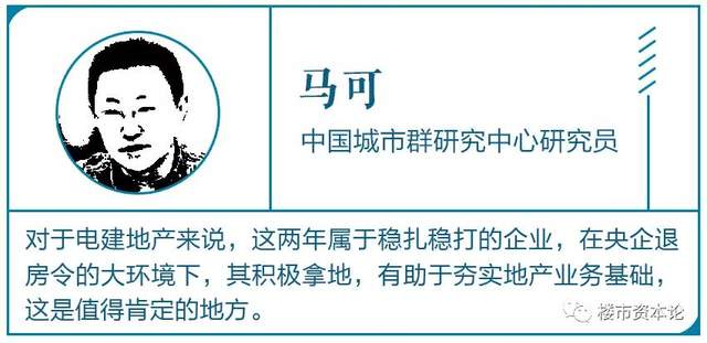 对此,中国城市群研究中心研究员马可表示,对于电建地产来说,这两年属于稳扎稳打的企业,在央企退房令的大环境下,其积极拿地,有助于夯实地产业务基础,这是值得肯定的地方。