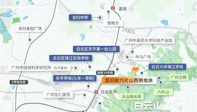 东侧为白云六中珠江学校(高中),南侧为广东实验中学,还有龙归中学、东平学校、永兴小学。其中东平学校(小学),与省实关系很好,未来有望纳入省实教育集团统一管理。地块西边规划一所36班九年制学校,远期还可以扩建为45班制。