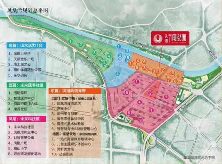 汎港润泓园位于凤凰湾核心位置,凤凰湾布局未来社区、滨水商娱、公共游憩等核心功能。整个地块规划采用了彩凤展翼的布局方式,形成凤首、西翼、东翼、凤尾四大板块。