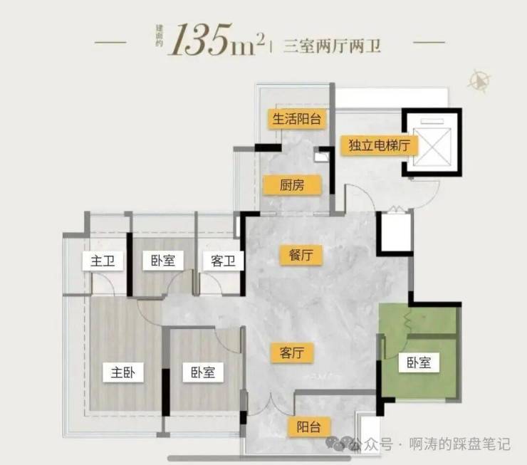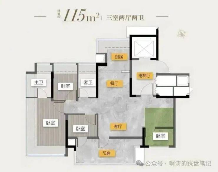 板楼2T2设计,高17层,主推建面115、135平户型。