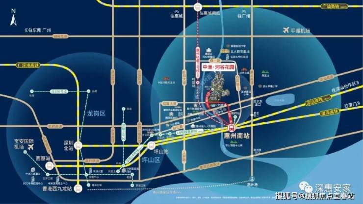 惠州南站多轨枢纽 1小时融城生活 惠州南站是粤港澳大湾区重要综合轨道站之一,厦深高铁约28分钟直达深圳北,约68分钟到达香港西九龙;深圳地铁14号线(在建中)延长线(规划中)官宣1-2年内动工,中洲・河谷花园近距离惠州南站、新桥站双地铁口(规划);深汕高铁官宣2020年动工,建成通车后约10多分钟抵达深圳南山;惠州轻轨1号线(规划中),是惠州南北交通大动脉;多轨枢纽助力“湾区1小时融城生活圈”。新桥一路、内环东路(建设中)、站前路(规划中)约10多分钟快速接驳南站