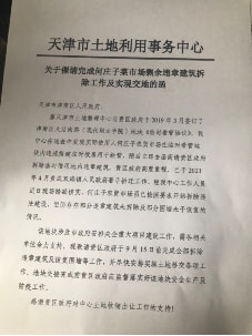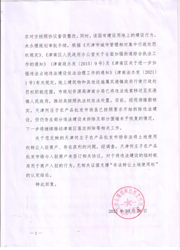 2021年8月,天津市规划和自然资源局直属单位天津市土地利用事务中心再次向津南区政 府发函表示,津南区政 府于2021年4月责成双港镇政 府着手拆迁工作,经核实,何庄子市场虽已按照要求开始拆除违法建设,但仍存在部分违章建筑未拆除及部分围墙未予恢复的情况。