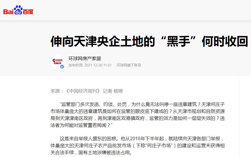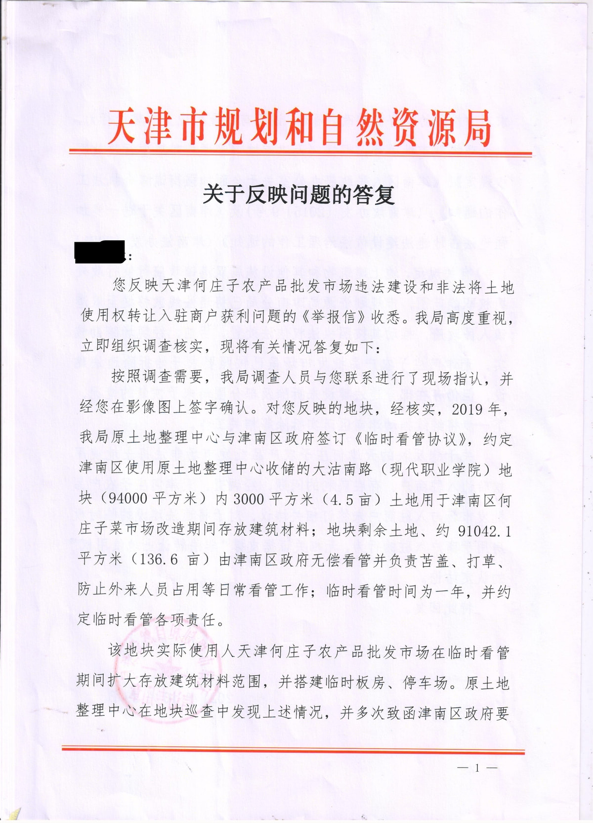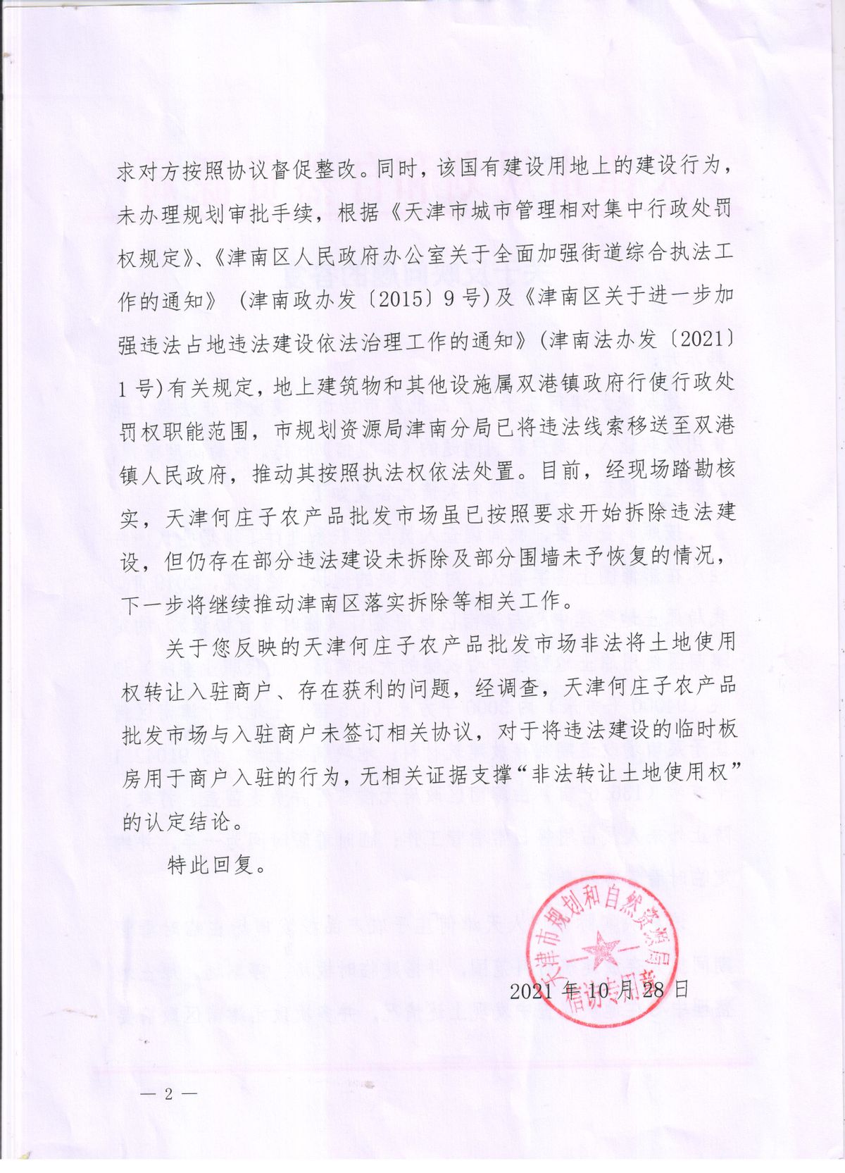 2021年9月,天津市规划和自然资源局确认了何庄子市场违法占用土地的事实,并公开了相关部门对该问题的处理结果及资料。