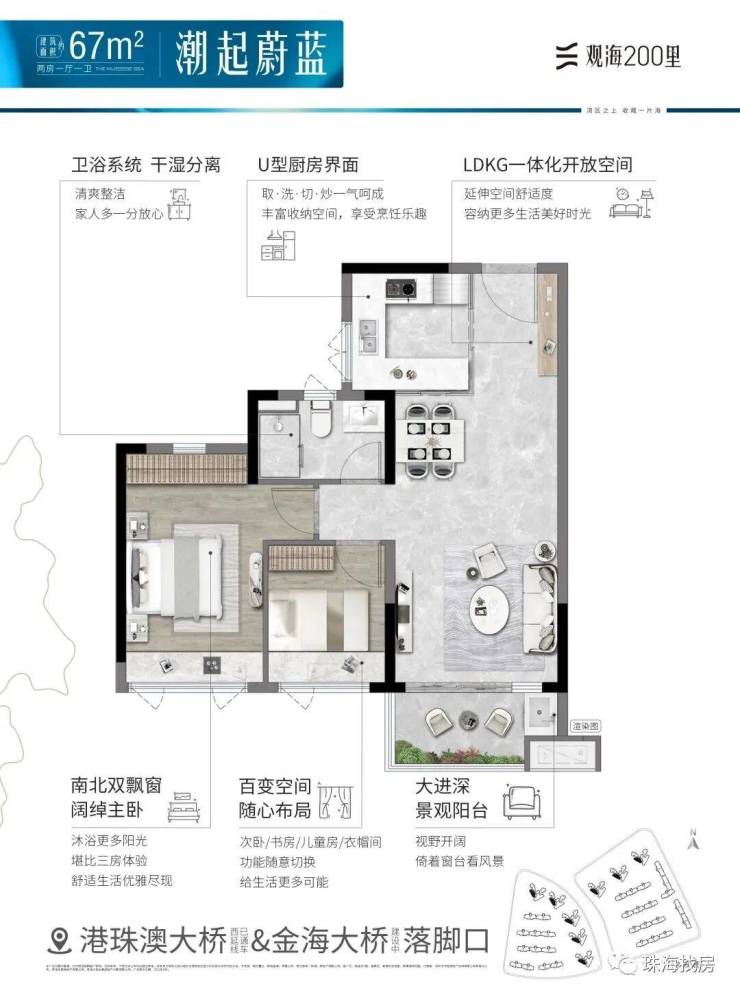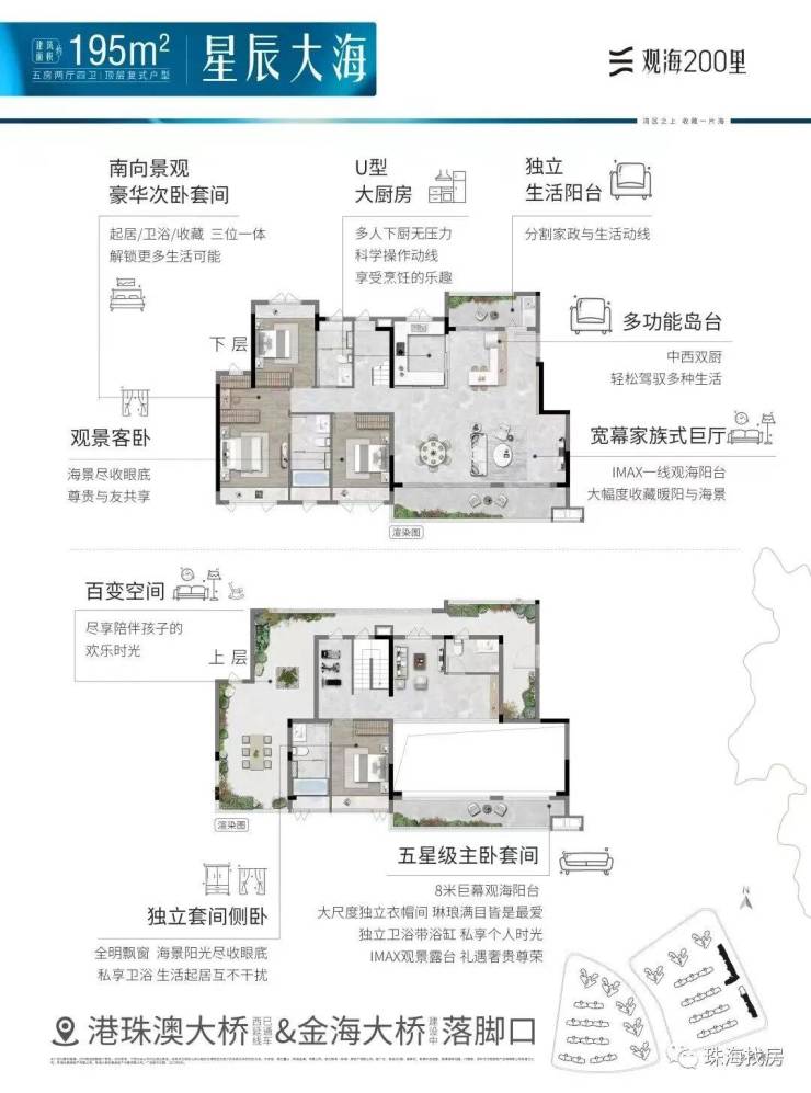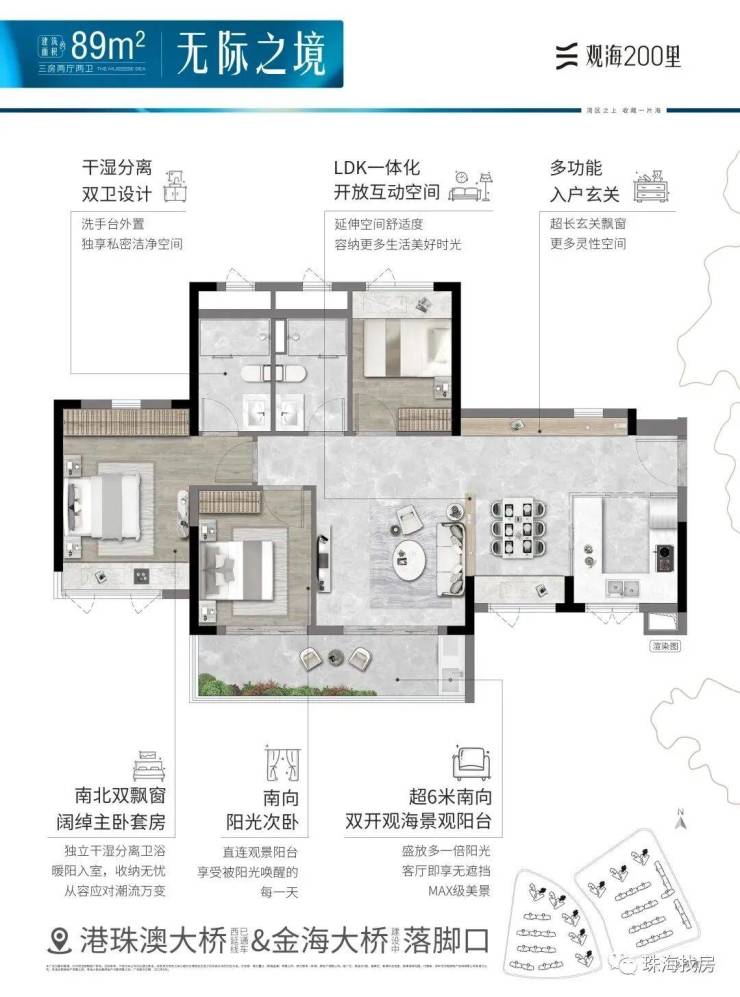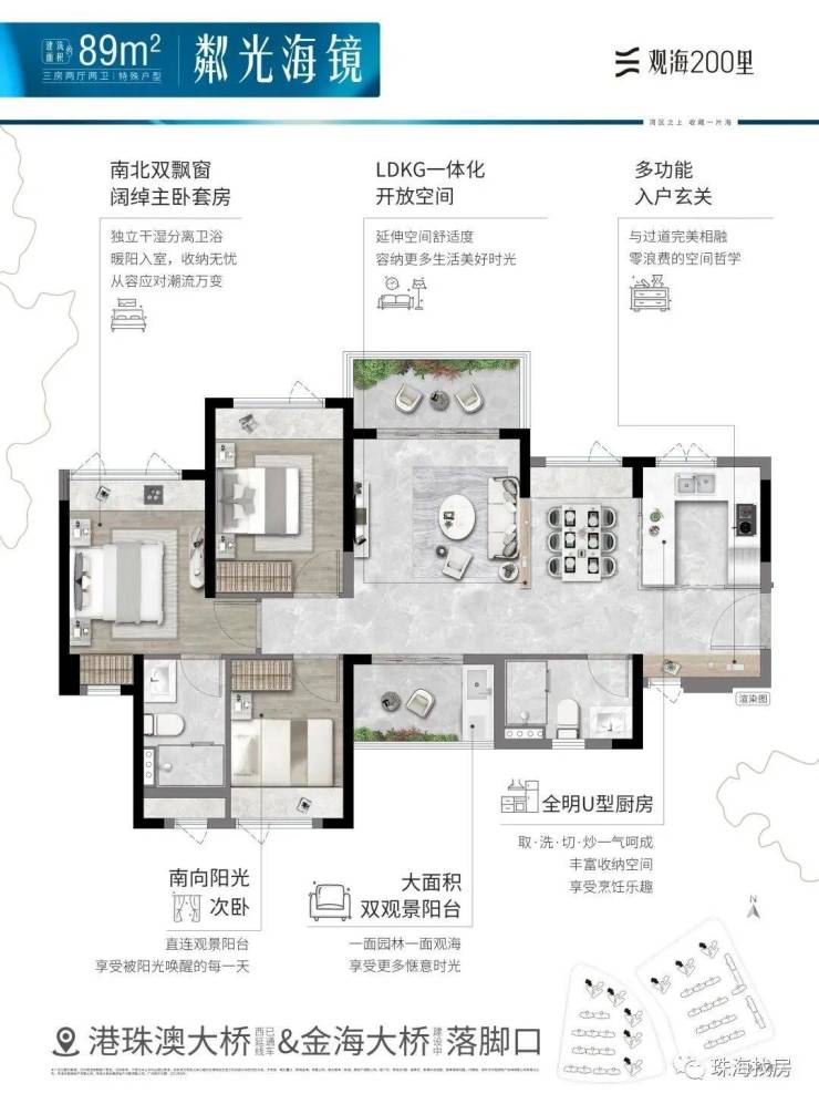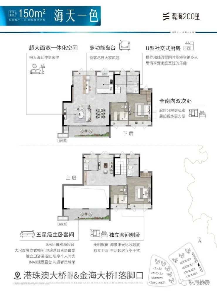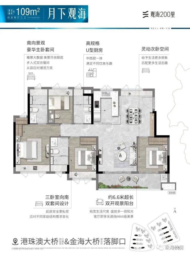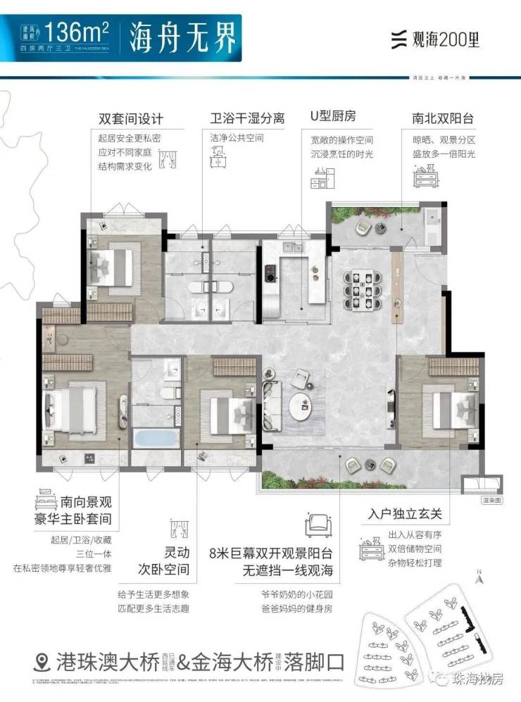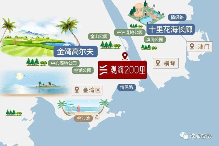 观海200里,择址全国最具发展潜力的城市群·粤港澳大湾区,在湾区九城中,独与香港、澳门路桥相连的珠海未来城市新中心——横琴西·滨海商务区,同时拥有路轨空三大立体交通网络,及拥有三面环海、天然海岸线、沙滩湿地等不可复制海岸资源的半岛地块,打造一线看海的海居3.0产品。