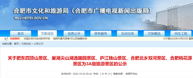 市文化和旅游局按程序组织综合评定肥东四顶山景区、巢湖尖山湖逸趣园景区、庐江独山景区、合肥北乡双河景区、合肥桃花源景区等5家景区达到国家3A级旅游景区标准要求,拟确定为国家3A级旅游景区,现予公示。