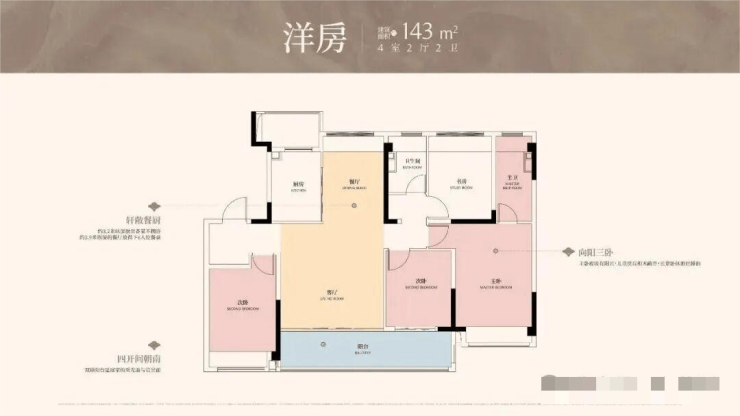 约143㎡洋房:将洋房舒适度推向新高度,实现了四开间朝南,主卧、儿童房、长辈房都充满阳光,餐厨空间也非常轩敞。