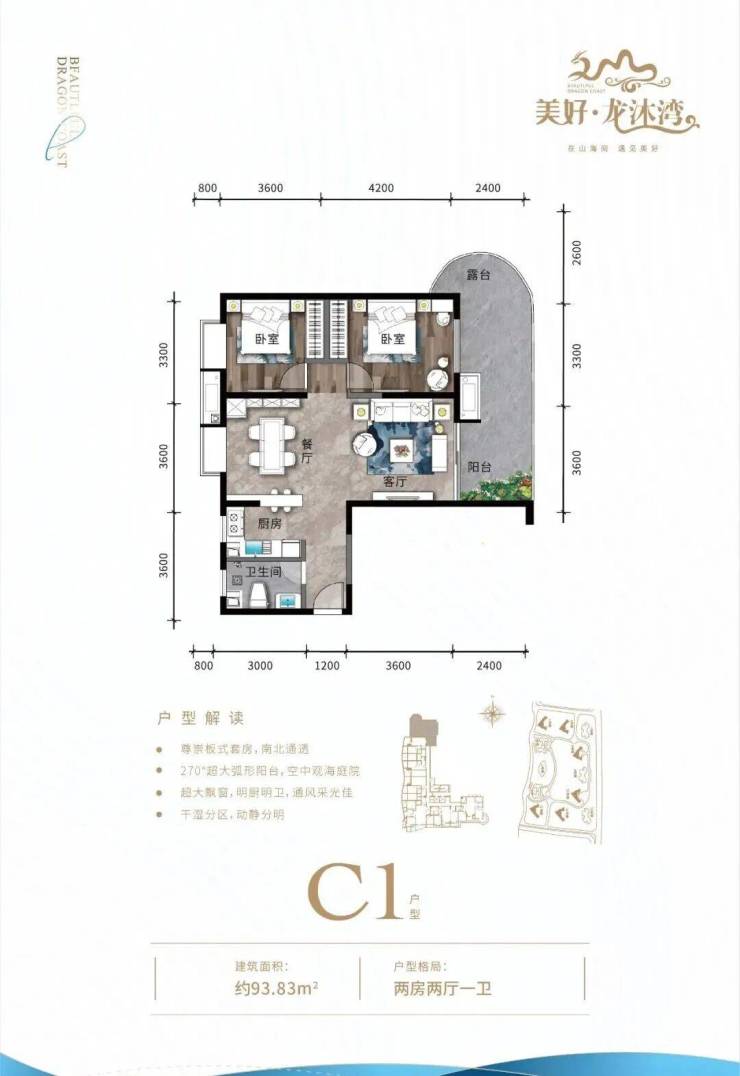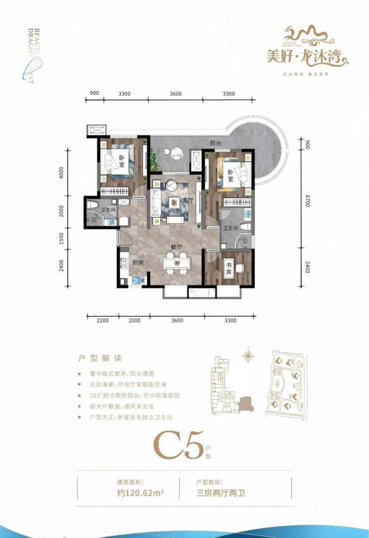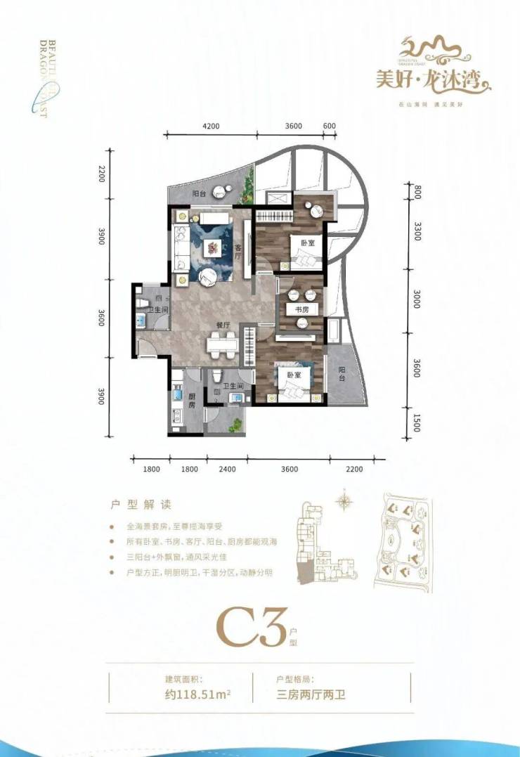 ④ 三房户型三面采光,空间方正合理,双独立明卫,270°环型瞰海阳台