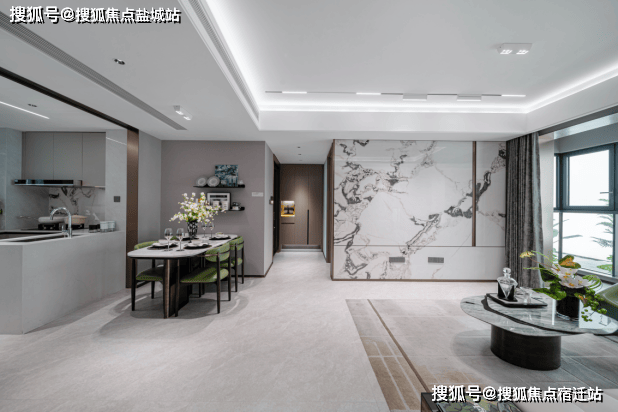 同时为让空间更凸显尊贵的艺术格调,室内应用大量大牌奢石元素,比如客厅背景墙、厨房挡油板选用了芬迪白岩板,浴室柜台选用了原产地为意大利的烟雨江南石材等,居家更显奢华高级感。