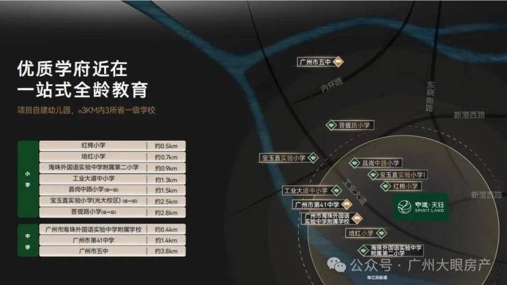 项目自带一所幼儿园,小学以上就要依赖周边,距离最近的公办小学是海珠区金碧第一小学(西校区)和海珠区石溪劬劳小学,两所小学对口初中分别在第五组和第七组。