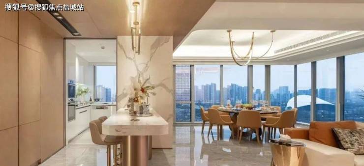 在美食区,白金沙天然石材打造的岛台,兼顾了颜值与实用性。在岛台的后面和对面,还有丰富的储物空间可以使用。这个300方空间整体非常方正,通透。南向面宽更是达到了阔绰的约16.2米,再加上全落地玻璃的设计,十分敞亮大气。顺着窗外望去,不远处的运河亚运公园更是能尽收眼底。