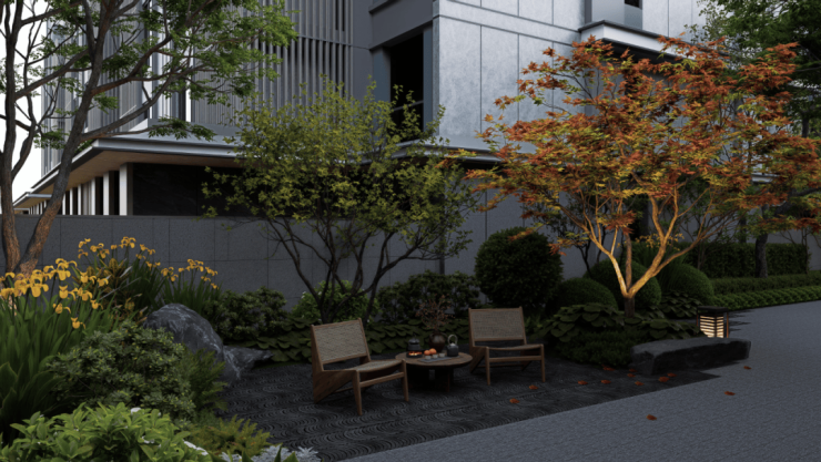 一重观境,自“相思引”主入口拾阶而上,步移景异,红枫、铁冬青、元宝枫等多样树木层叠如画,营造出富有层次的归家序章。