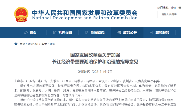 近日,国家发改委发布《关于加强长江经济带重要湖泊保护和治理的指导意见》(以下简称《指导意见》)。《指导意见》明确,到2035年,长江经济带重要湖泊保护治理成效与人民群众对优美湖泊生态环境的需要相适应,基本达成与美丽中国目标相适应的湖泊保护治理水平,有效保障长江经济带高质量发展。