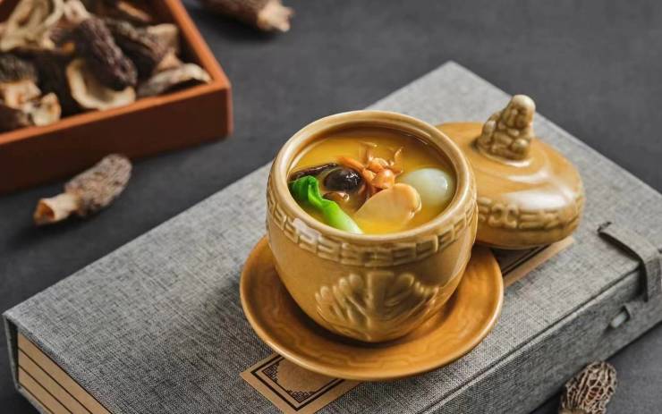对喜爱美食的人来说,中餐厅“御香苑”的狮子头和佛跳墙堪称经典。这家餐厅的来头不小,由岭南画派代表人物关山月亲笔题字,行政主厨贾榜民是新派官府菜创始人之一,他烹饪的鳕鱼狮子头,选择健康的深海鳕鱼,搭配虾、马蹄等,与鸡汤共同烹制,可谓“清淡不淡,肥而不腻”。佛跳墙作为福建名菜,传统材料包括鲍鱼、海参、鱼唇等。贾师傅的什菌佛跳墙更为精致爽口——八种野生菌、鸽子蛋、鸡汤,用陈年花雕封坛,慢火焖煮8小时,开坛时,汤汁稠浓,散发着淡淡酒香。