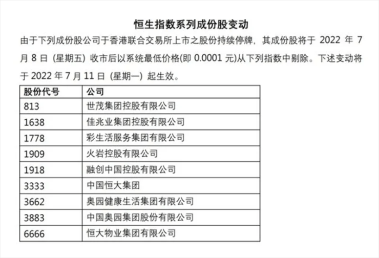 此前6月30日,香港恒生指数有限公司发布较新指数调整公告称,由于世茂集团、佳兆业集团、彩生活、融创中国、火岩控股、中国恒大、中国奥园、奥园健康和恒大物业股份持续停牌,其成分股将于2022年7月8日收市后以系统较低价格(即0.0001元)从恒生系列指数剔除,自7月11日起生效。