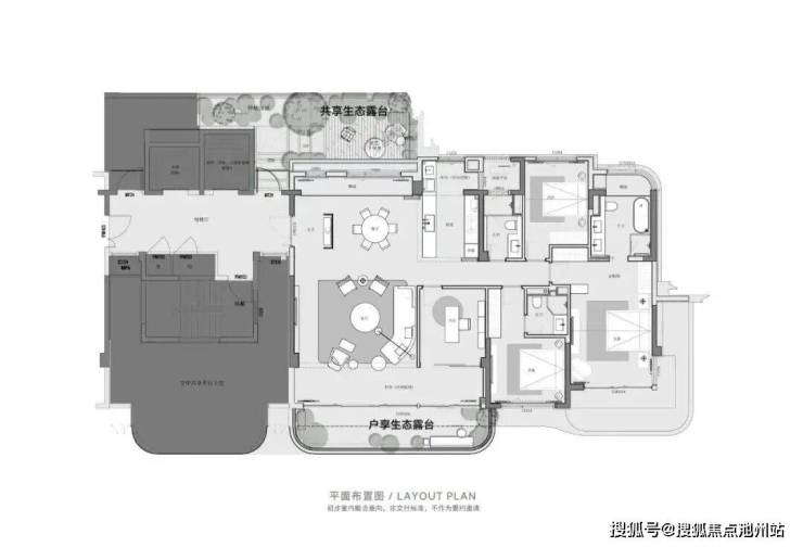 以建面约 172㎡的偶数层户型为例,该户型将露台与阳台相互融合,形成双开间大面宽的格局。