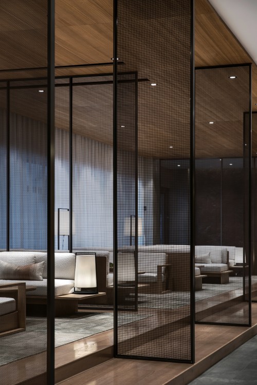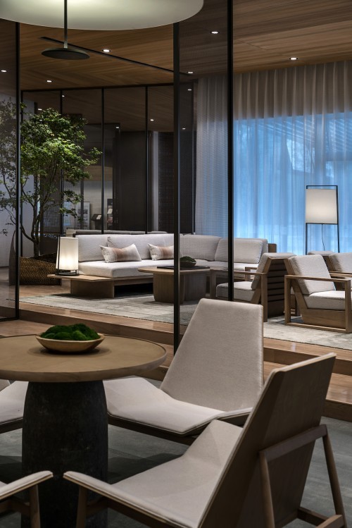 沙发洽谈区不设屏风,空间因此有了起承转合,开放式视线,每个结构都兼具了包容性。散客洽谈区的布局,围合而克制,但与其他空间因一切有了光的流动和停留,而又让彼此各自推向独立,又在整体归一中实现了互为对话。这里,更像是一个不疾不徐等待清晨到来,或因流连暮色而静静发呆的一个空间。幻似时空隧道,一切应了光的进来、穿透或停留或离开,在自然与简单中平衡出诸多美的心境,寂寥而美好。
