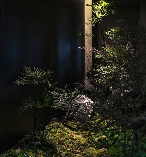 我们通常所用木饰面,取自生生不息的大自然,而苔藓就像覆盖在地表的生灵,两者结合似又找到了搬运大自然、重获生机的美好。VIP室同样以室内景观化的手法,让空间心生温暖。来自大自然中质朴而原始的材料,当木炭经处理后,与鲜活的苔藓共生,那一刻空间又重燃生命张力。