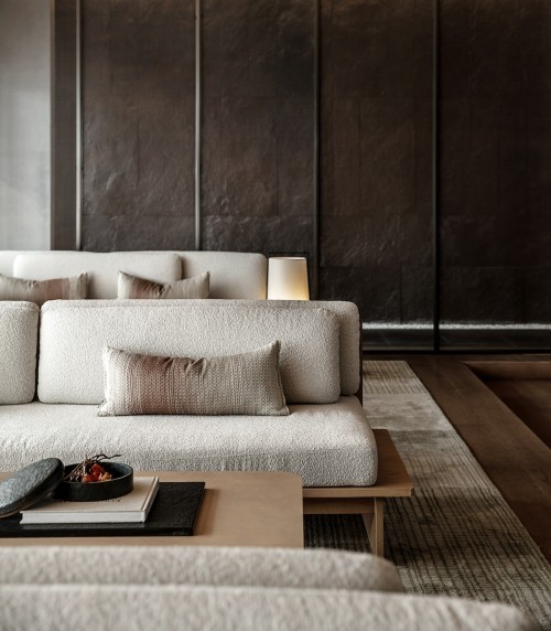 从室外进入室内,人与空间的认识,需要通过短暂的陌生感适应。就像猫突然闯入一间完全陌生的屋子,自带防备与攻击性。前厅的体量感冲击,厚重围合式的张扬,刻意制造了短暂的严肃,让你在略显克制的氛围中,建立与外部的疏离,快速进入一个全新的环境。