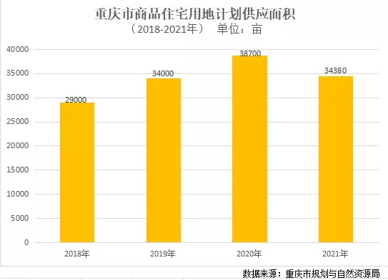 我们再继续仔细解读数据,今年重庆的商品住宅用地全年计划供应2292公顷,如果换算成往年的以亩为单位计算,那就是大约34380亩。相比2020年供应的38700亩,减少了约12%。