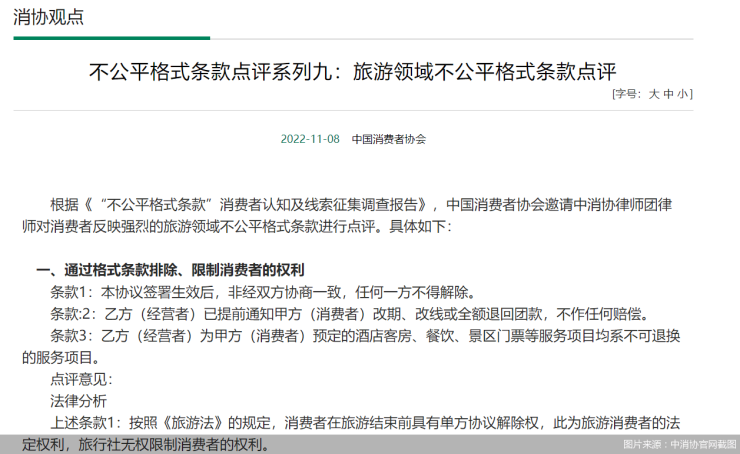 此次中消协律师团主要点评了消费者反映强烈的旅游领域不公平格式条款。其中就包括经营者已提前通知甲方消费者改期、改线或全额退回团款,不作任何赔偿。