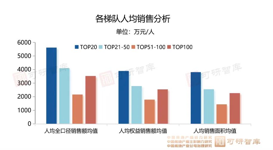 可研智库研究发现,2020年,从人效表现来看,房企各梯队之间差距依然明显,但间距逐渐拉近,行业内具有管理水平优势、最早专注效能提升的头部房企,效能表现达到了边际顶点。人效排名前列梯队TOP20企业人均全口径销售额为5604.13万元/人,与2019年相比基本持平。但在业绩提升的主要原因下,TOP51-100房企人效表现大幅提升,并直接推动行业人均效能水平提升。