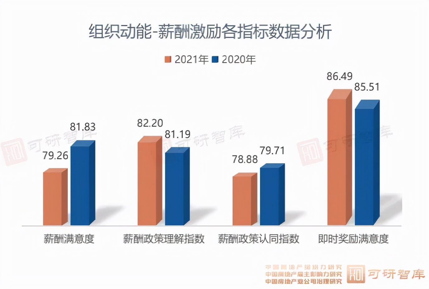 总体来看,2021年,员工敬业度评分的大幅下滑值得重点关注,该项得分仅为82.31分,较上年下滑7.56分。员工对组织健康状态的负面评价多集中在机制建设与薪酬激励层面。组织力内部的各项因素中,人才培养与文化塑造对员工的影响是潜移默化的,机制建设与薪酬激励的影响则立竿见影。员工在机制建设和薪酬激励方面的低评分说明房企当前面对市场变化中的管理举措存在一定缺失。