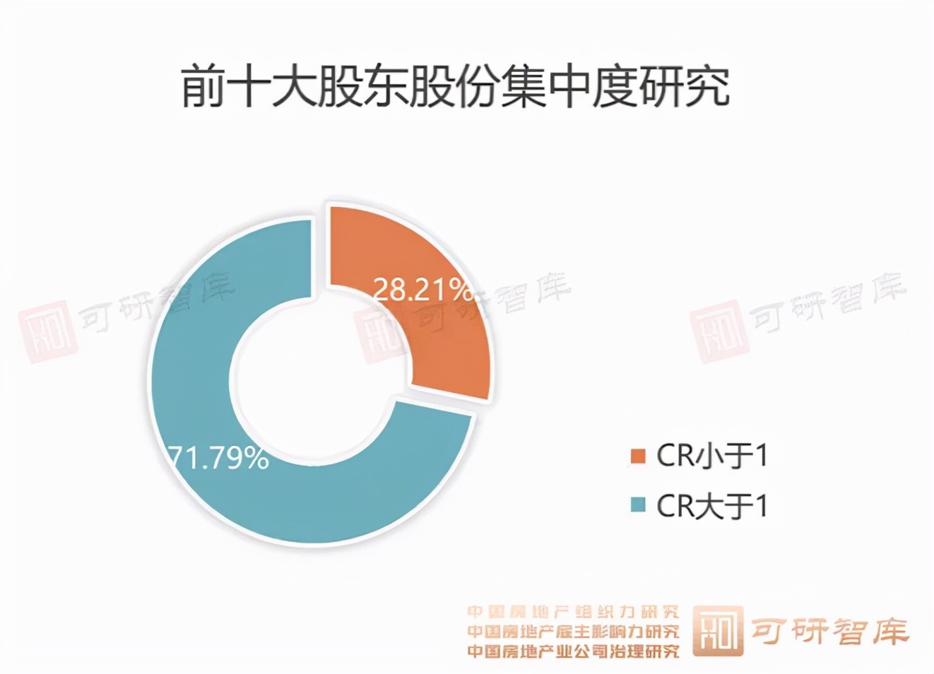 例如,我们发现,一股独大股权结构在房地产行业内较为普遍,股份集中度CR值大于1的房企达到样本企业总数的71.79%,说明大部分房企属于股权高度集中型,排名前列大股东具有特别控制权。